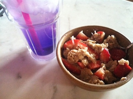 She topped oatmeal with nut butter, but I am more of a fruit or raisin kind of girl. I topped mine with organic strawberries and a few pieces of coconut flakes. It was so light and fluffy! I have never had good luck with overnight oats so I was nervous to try anything else, but this was so tasty. I love that it was still a warm breakfast too.