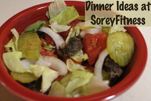 I could seriously eat this dinner every week, and it will be back in my meal plan rotation! It’s a grilled hamburger bowl! It’s a hamburger topped with onions, pickles, lettuce, and tomato. I also added a little ketchup and mustard to it. Yum, yum, yum!!